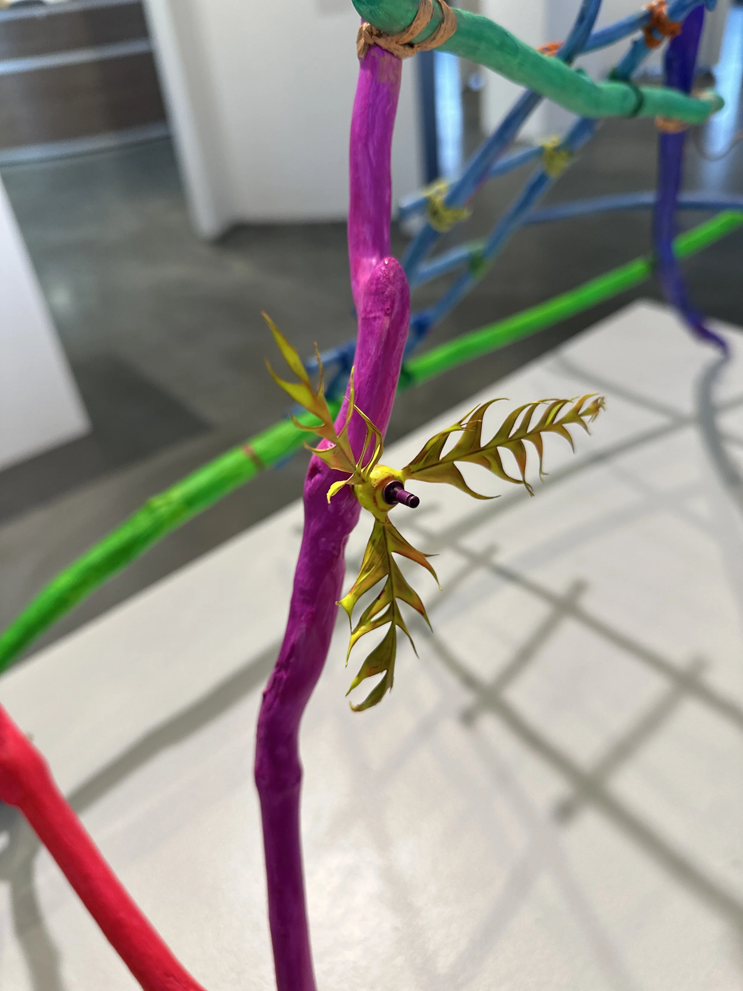 Drought Totem for a Water Witch is a bold, free-standing, abstract, mixed-media sculpture crafted from vividly painted branches in neon blue, pink, yellow, and green. Built in a dynamic, totem-like form, the piece incorporates a ladder, rings, balance, wheel, propeller and net elements. These components evoke themes of ritual, resilience, and the deep connections between nature and culture; bridging the past and the future through its vibrant visual narrative.