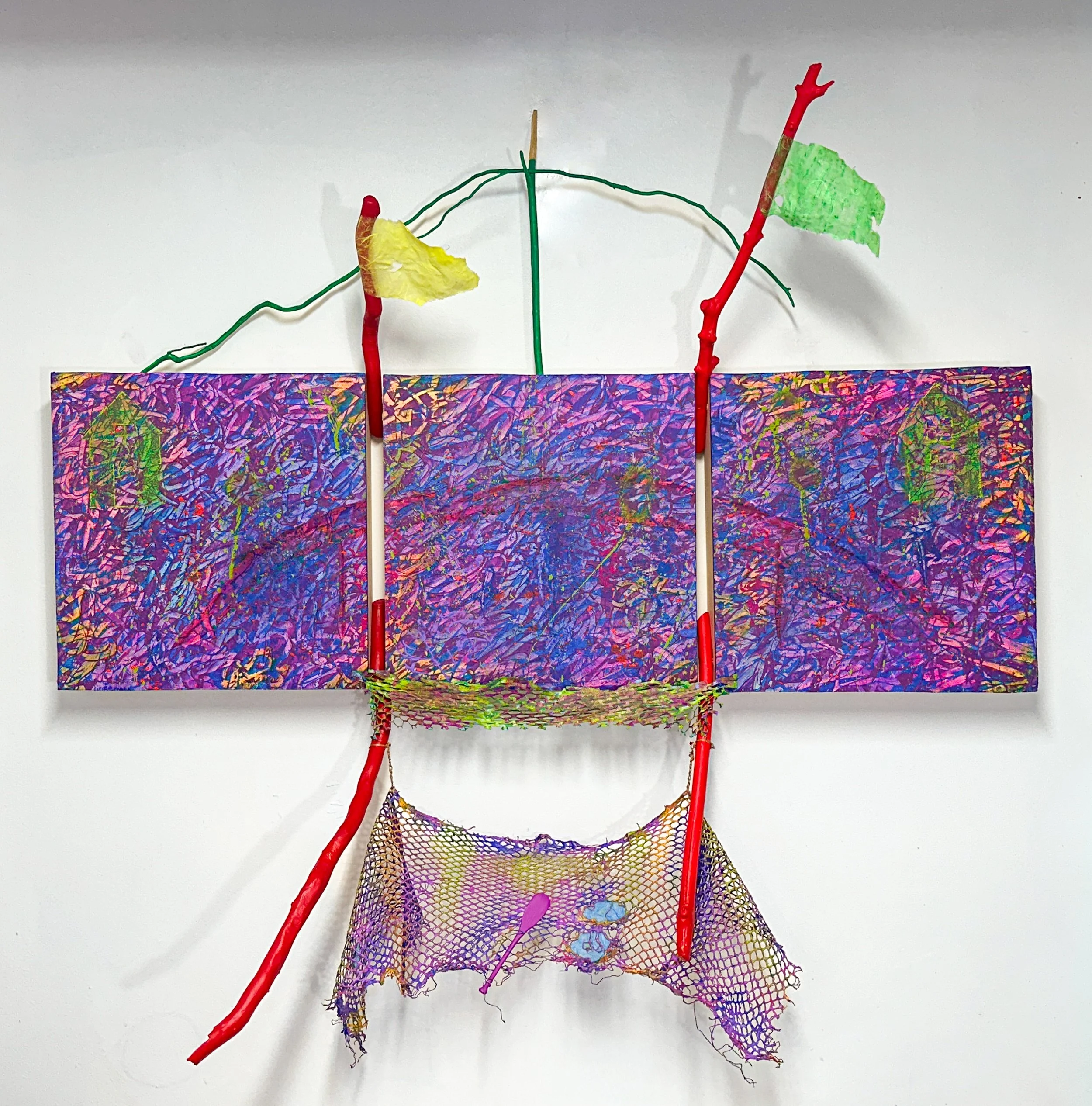 Below the painted surface, suspended nets stretch between the red uprights. Within the lower webbing, a small canoe paddle is caught, evoking travel, effort, and human agency interrupted mid-journey. The upper net functions as a connective tissue, simultaneously binding the two ends of the bridge and revealing its vulnerability. It holds, entangles, and connects; suggesting that passage is possible, but never without risk or negotiation.