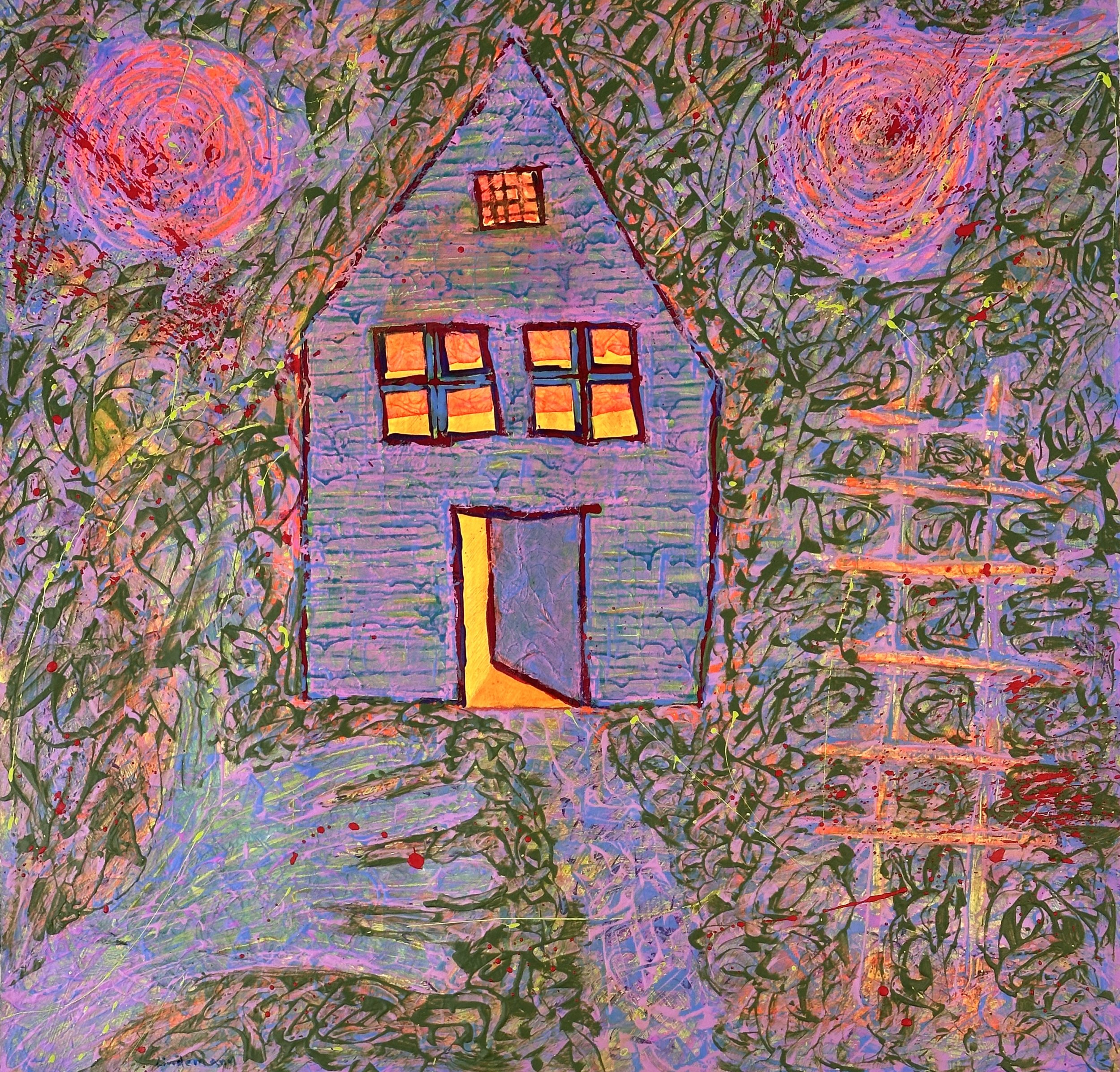 Only Way Out Is Through is an abstract acrylic painting centering on a solitary house set in a whirling field of color. The structure feels both protective and exposed, its glowing windows and open door offering warmth amid the turbulence. Home, like mind, appears as a refuge from the chaos extant, yet it is not isolated.