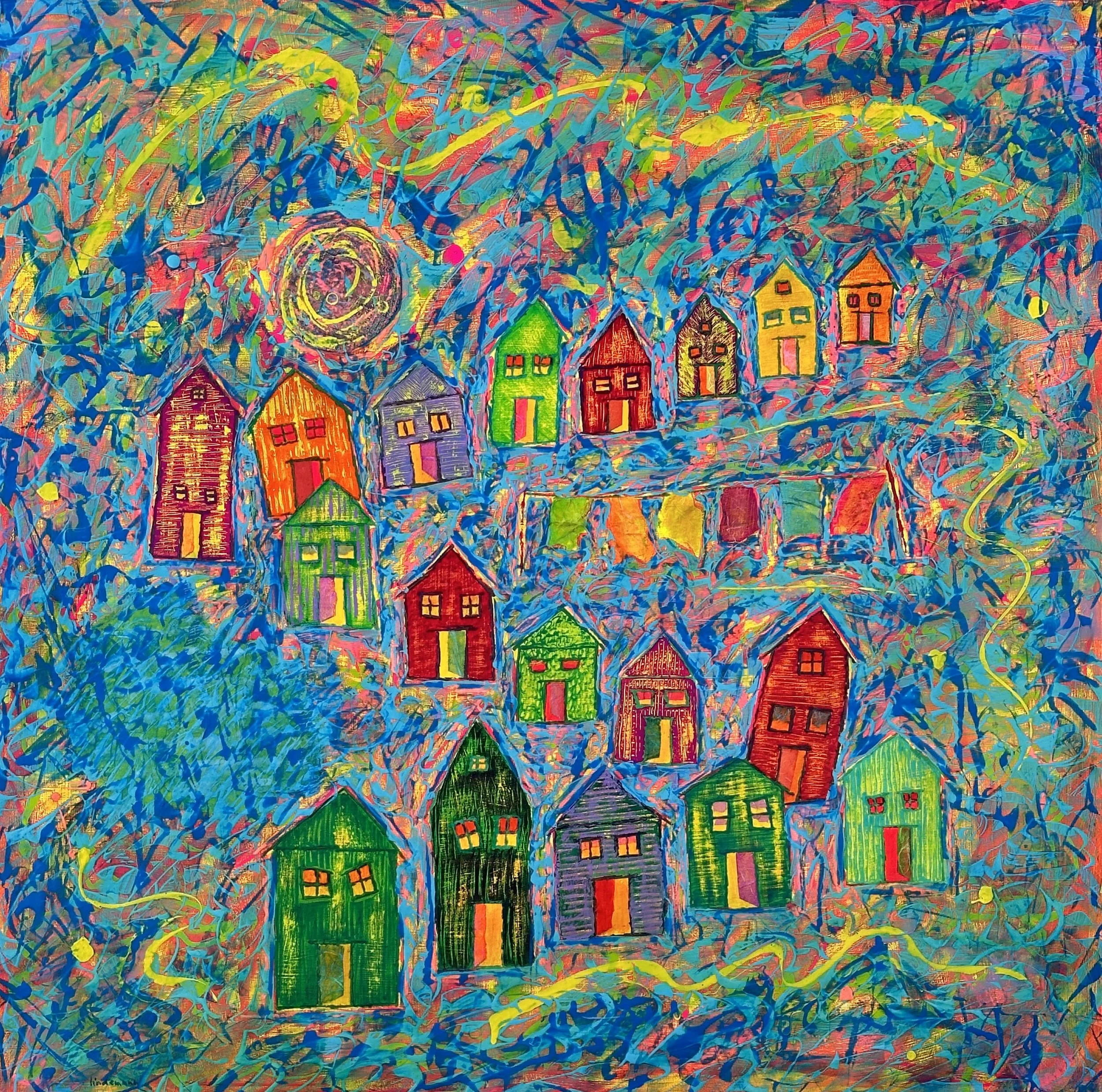 I began with drawing a community of house-like forms. As the work developed it felt less like I was creating buildings and more like they were stand-ins for our personalities, like masks. Doors are ajar like parted lips; windows glow with emotive energy like eyes. The structures are gathered together, but it’s not entirely clear whether they’re comforting one another or watching and whispering with hidden intent.