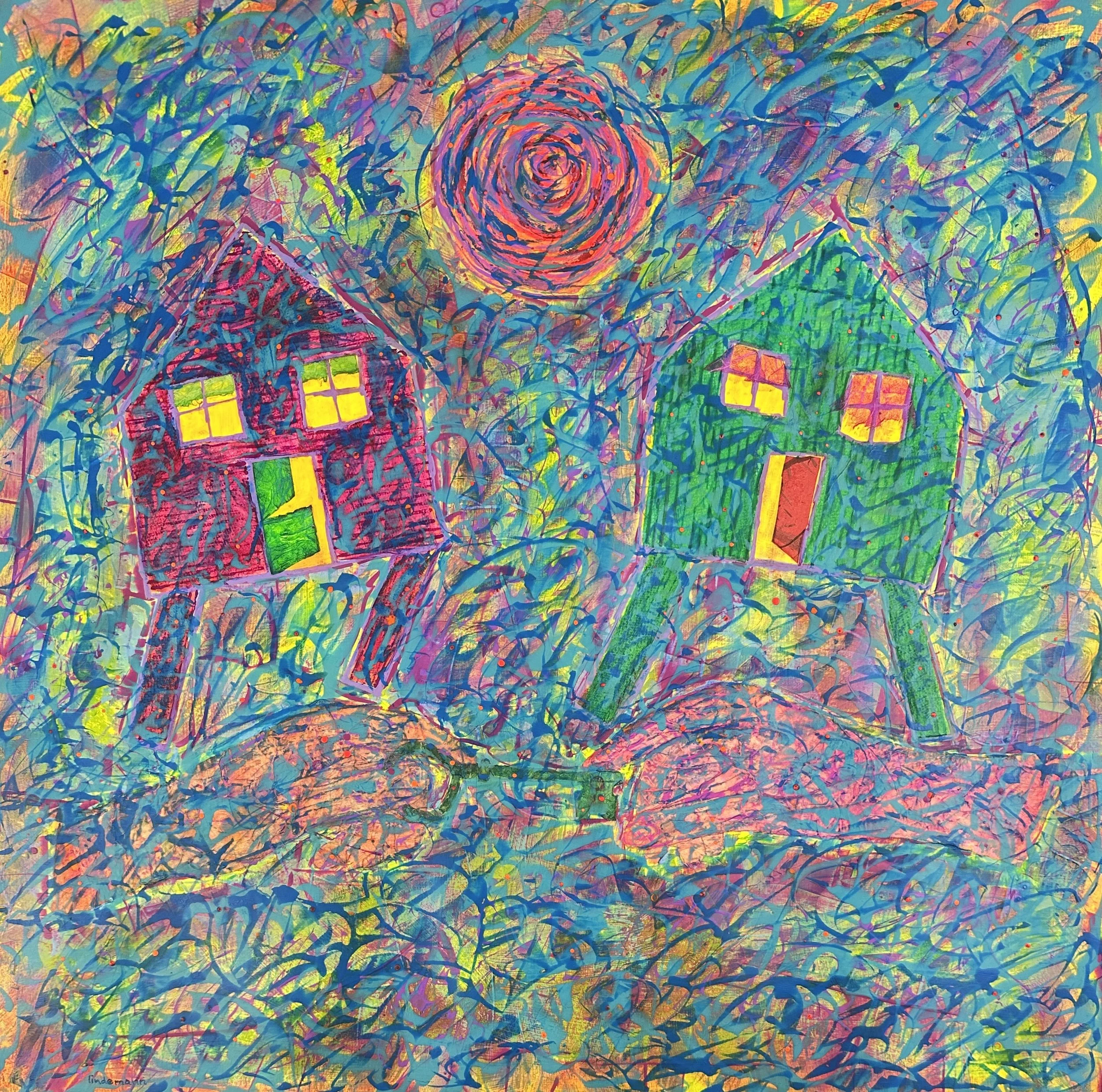 Above the houses hovers a radiant spiral, something between a sun, a planet, and the slow gathering of a deep thought. I think of it as a quiet gravitational presence shaping the moment below.